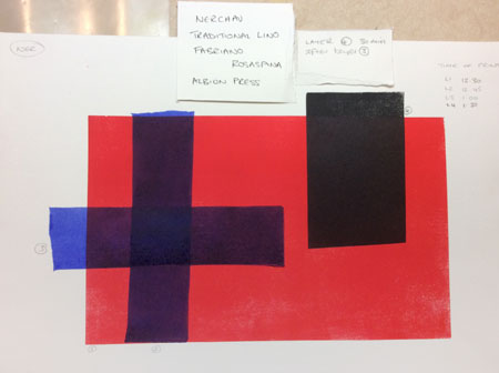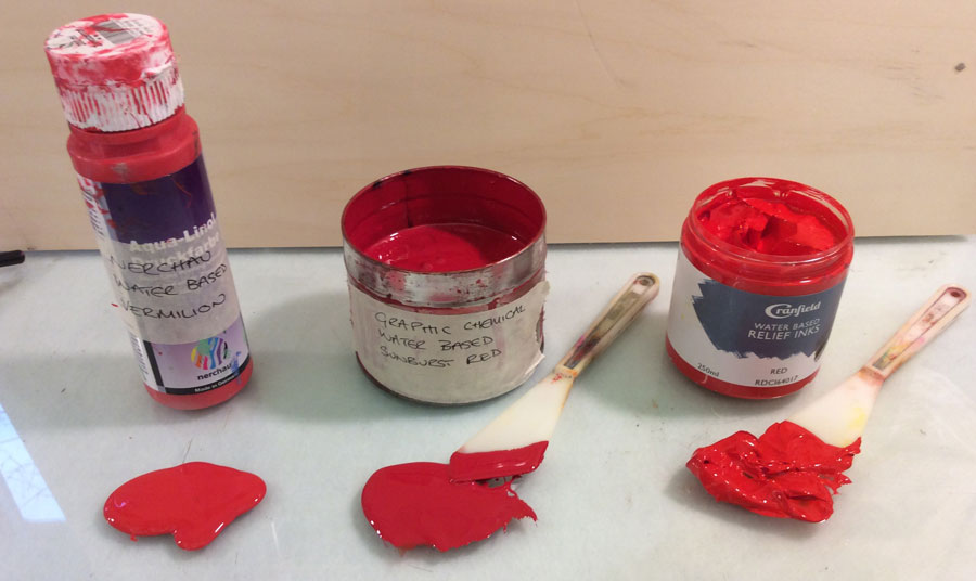 My group students work with the reduction method without a press. They do not mix colour, they use the inks as they come from the manufacturer and a few colours I have premixed in advance. However they print several copies of their work in an assortment of colour layers. Teaching in this way requires ink that stays open when mixing yet dries fast on paper, is economical and reliably available, comes in appealing colours and is opaque as possible. Novices cannot be expected to allow for colour changes caused by previous layers of ink so the ink’s ability to print as true as possible over another colour is preferred.