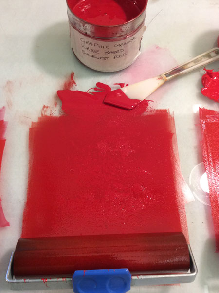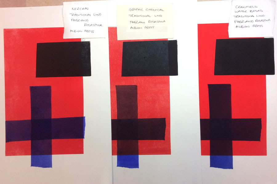I’ve tested Cranfield’s inks alongside the water-based inks that I use for teaching made by Nerchau and the water based inks by Graphic Chemical that I use for my own work. Teaching and editioning personal work make slightly different demands on the inks as follows: