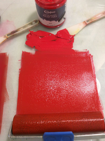 I used the same soft Japanese rubber roller for inking up all the inks (the three blue handled rollers in the photos were not used for inking, merely to show the ink’s texture on an economy roller).