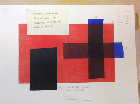 I do not use Nerchau inks for my own work as I find the pigments too chalky and conventional. I don’t like using their bottles under studio conditions. However, I will still prefer to use Nerchau for my students in preference to Cranfield and Graphic Chemical because it is their chalky pigment and predictable colour that allows novice students to layer colour straight from the bottle with the colour minimally affected by the previous layers of ink. In addition, the bottle I dislike in the studio works well in a class as students can’t muddle inks with knives and find it easier to judge how much is needed.