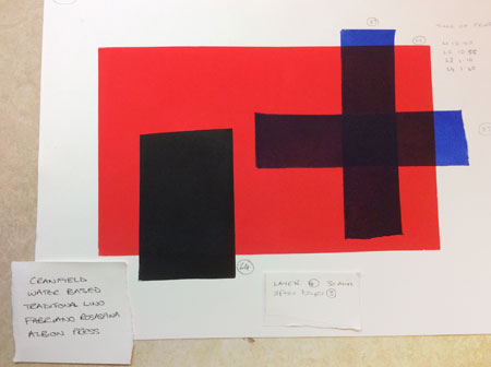 Blue overlays have best ‘blue’ retention over the red of the three and are least affected by the underlying colour, but the black is weaker in pigment than the others |
