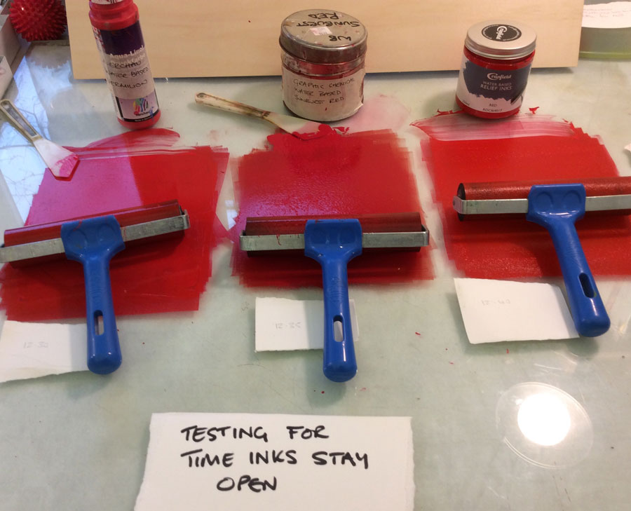 I tested all the inks rolled out for printing to simulate the worst class conditions where inks are left rolled out rather than in a dollop. All the inks stayed open an unexpectedly long time, far beyond anything I would expect to require in a class or for myself.