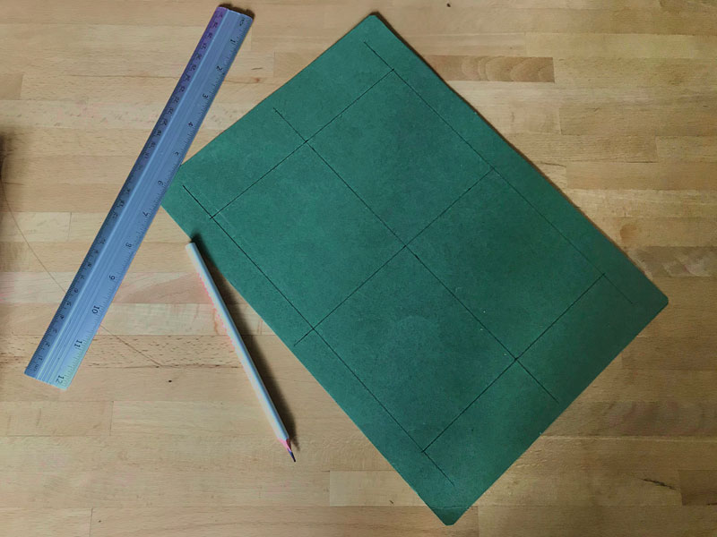 4. Using a piece of scrap paper the size of your printing paper, draw two lines bisecting the card across the centre. Line the paper up with the matching lines on your card. Use the paper as a guide to rule a line across one of the short ends of your card. Doing this will help you to keep your lino print squared up with the edges your printing paper.