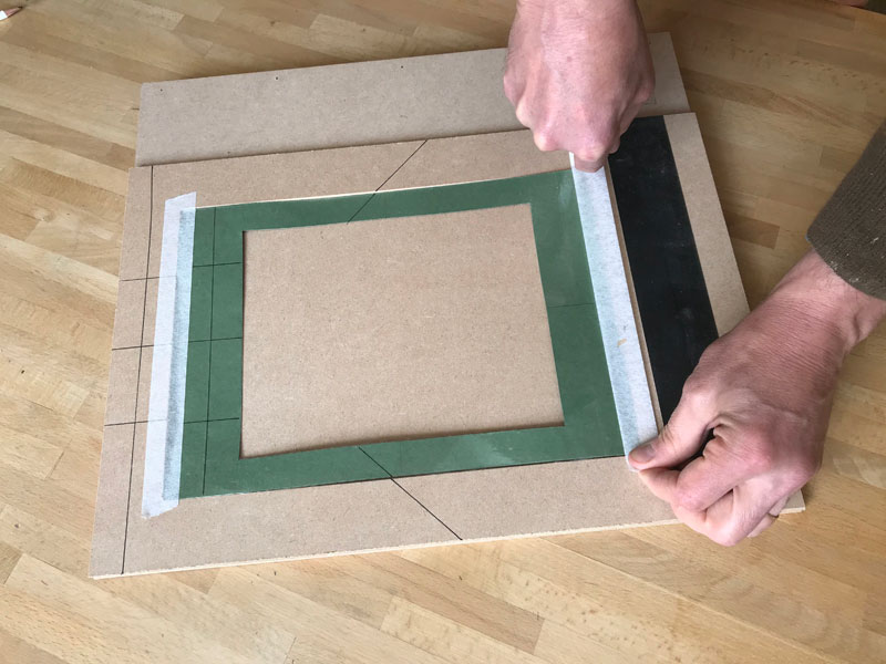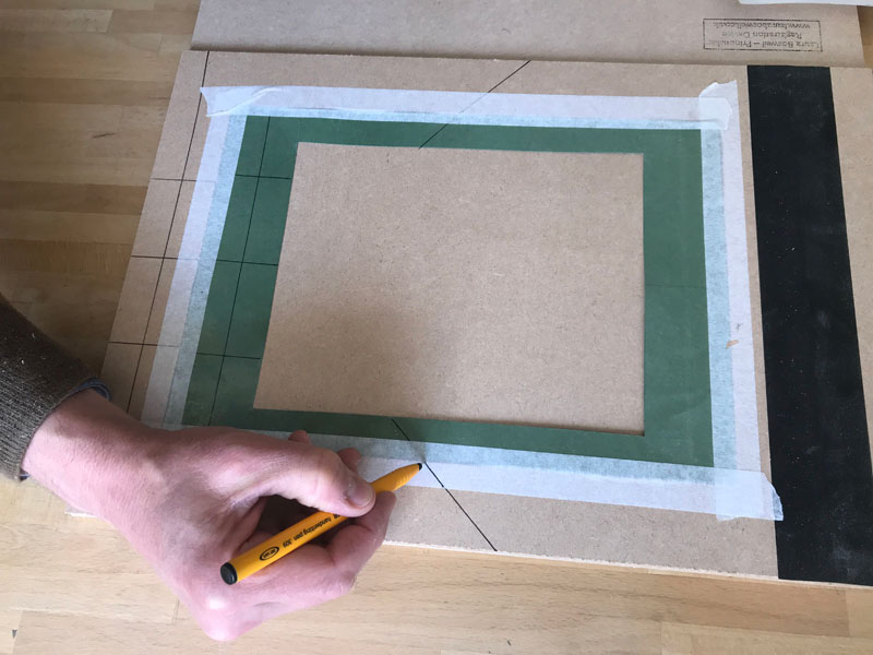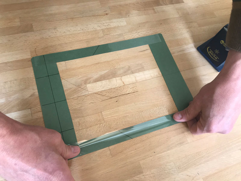 7. Rub down the card’s edges from the inside of the frame to push the card fully into place. You may need to re-draw your registration lines over the masking tape to make them clear.